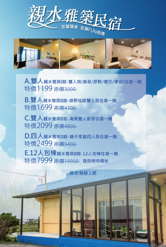 只要1199元起,即可享有【宜蘭羅東-親水雅築民宿】海景~親子~包棟~宜蘭FUN假嚕~ABC.雙人/D.四人/E.12人包棟〈含A.親水雅築I館-雙人房(春草/原野/櫻花/麥田)/B.親水雅築II館-綠野仙蹤雙人房/C.親水雅築II館-海景雙人套房/D.親水雅築II館-親子家庭四人房/E.親水雅築II館-12人包棟 住宿一晚 + 無線上網,E方案另含烤肉場地〉