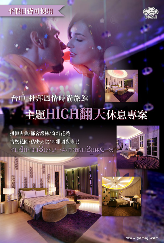 【杜拜風情時尚旅館】再度與GOMAJI攜手合作,限時推出主題HIGH翻天休息專案,輕鬆享有多樣充滿異國風情的主題房型休息2~4小時。情侶熱情甜蜜的出遊休息,各種主題房型搭配頂級設備,絕對讓你HIGH翻休閒時光!